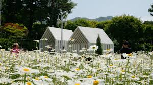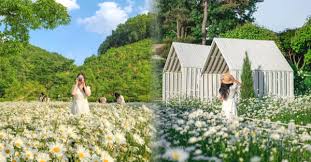 강화도에 위치한 마호가니 카페 앞마당에서는 5월에 샤스타데이지 꽃이 만개하여 하얗고 노란 색감의 꽃밭에서 인생 사진을 남길 수 있습니다.