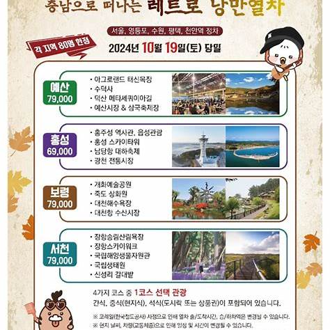 **‘충남으로 떠나는 레트로 낭만열차’**는 1970~80년대의 감성을 재현한 특별한 기차 여행 프로그램으로, 충청남도의 아름다운 풍경과 함께 복고풍의 추억을 만끽할 수 있는 당일치기 여행 상품입니다.CC Daily News+8네이트 뉴스+8매일경제+8