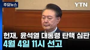 헌법재판소는 2025년 4월 4일 오전 11시, 윤 대통령에 대한 탄핵심판 선고를 진행하였습니다. 헌재는 윤 대통령의 비상계엄 선포가 헌법과 계엄법이 정한 실체적 요건을 충족하지 못하였으며, 국회의 권한 행사를 방해하는 등 헌법과 법률을 위반했다고 판단하였습니다. 이에 따라 헌재는 만장일치로 윤 대통령의 파면을 결정하였습니다. 한겨레+5YTN+5헤드라인제주+5위키백과, 우리 모두의 백과사전+3헤드라인제주+3한국경제+3한겨레+2다음 뉴스+2한국경제+2