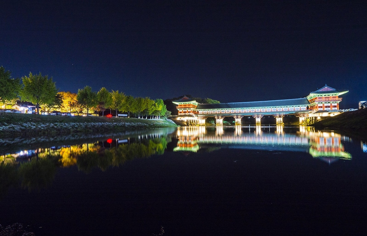 - 교각 전체 실루엣과 주변 한옥 조명까지 포함된 뷰