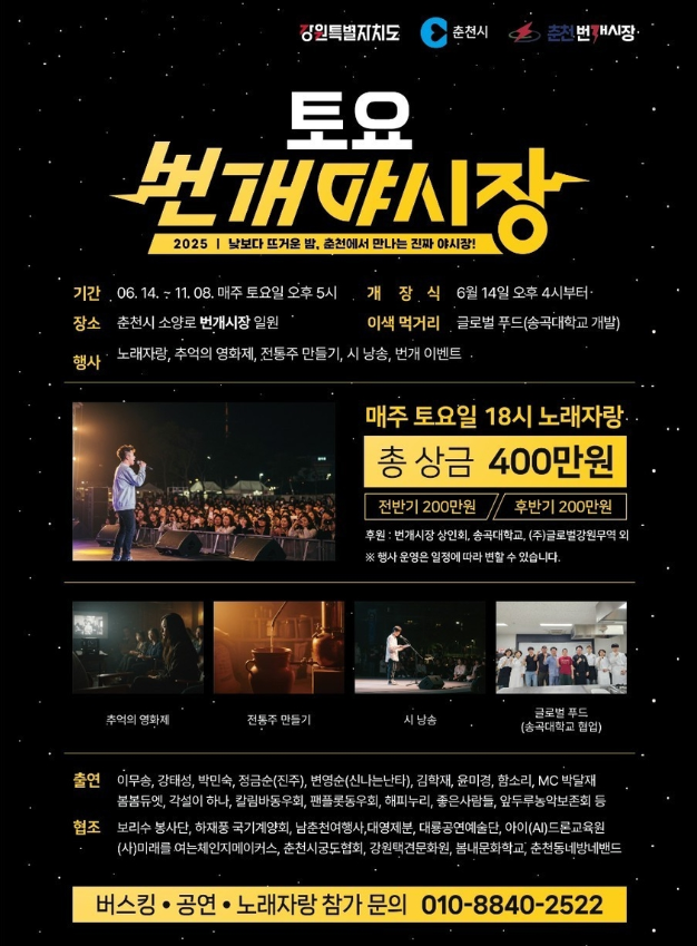 춘천 번개시장 일대에서 매주 토요일 진행되는 **‘토요 번개야시장’**이 오는 6월 14일(토) 오후에 개장식을 시작으로 11월 초까지 운영됩니다.