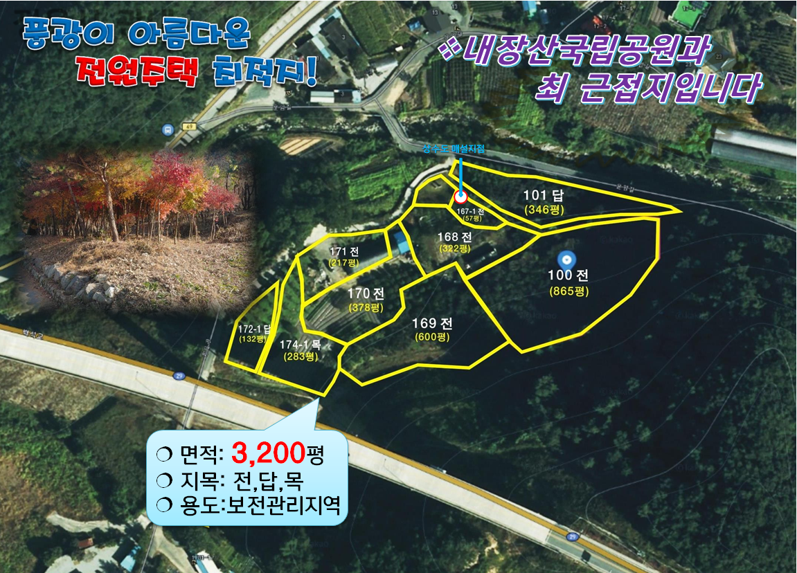 - 내장산국립공원과 근접한 지역일 경우, 경관 및 생태보호 목적의 개발 제한이 더 강화될 수 있습니다.