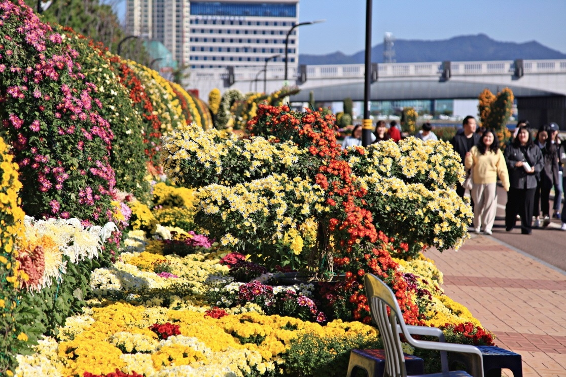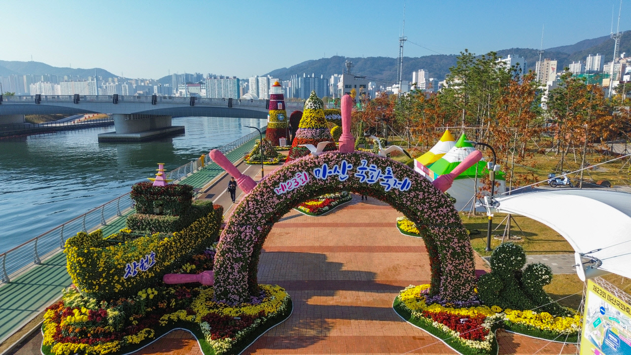 ‘푸른 바다’라 불릴 만큼 해양 분위기가 살아있는 마산 앞바다, 여기에 금빛·주홍빛 국화 꽃잎이 물결치듯 펼치는 풍경은 사진 찍고 싶은 순간이 산더미예요.