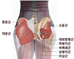 엉덩이는 **둔근(대둔근)**이라는 큰 근육 덩어리로 이뤄져 있어요.