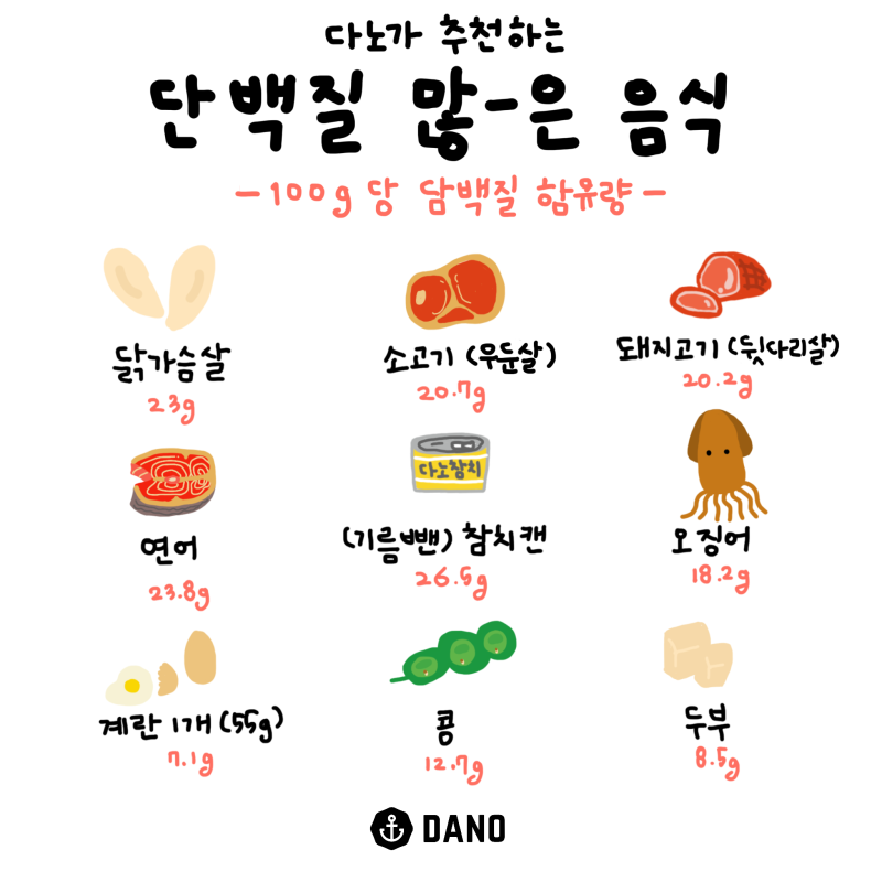 - 달걀, 닭가슴살, 두부, 생선을 매끼 한 가지 이상