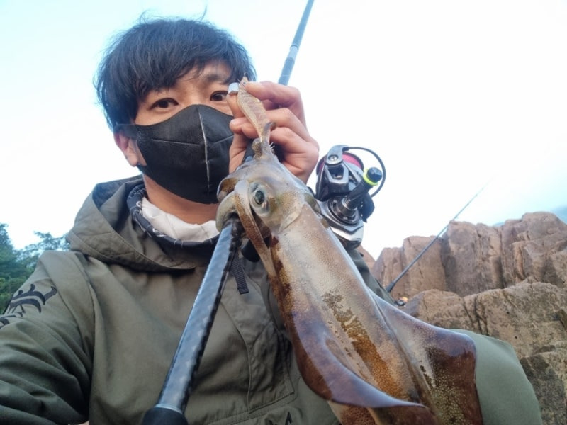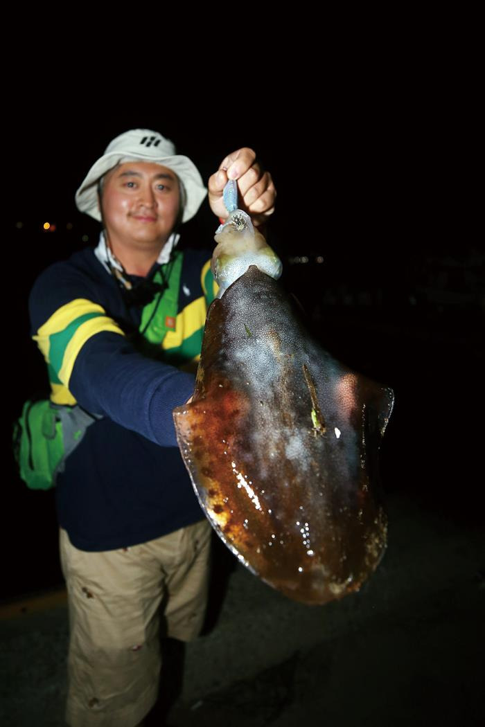 출조 당일, 해가 지기 시작할 무렵부터 하기 시작한 팁런 에깅. 수심 얕은 갯바위 인접지역에서 에기를 천천히 흘리던 중 강한 입질이 왔고, 드랙이 시원하게 빠지는 순간부터 ‘이건 한 덩이 나가겠다!’ 직감이 왔습니다.