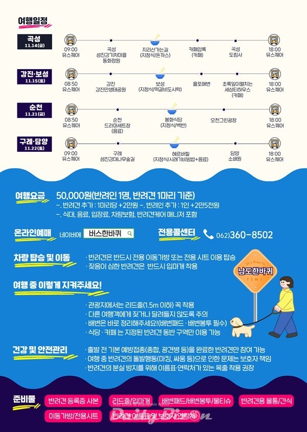 - 전라남도가 운영하는 시티투어 프로그램 ‘남도한바퀴’가 반려견 동반 특별여행 코스를 선보였습니다. 오마이뉴스+2지이코노미+2