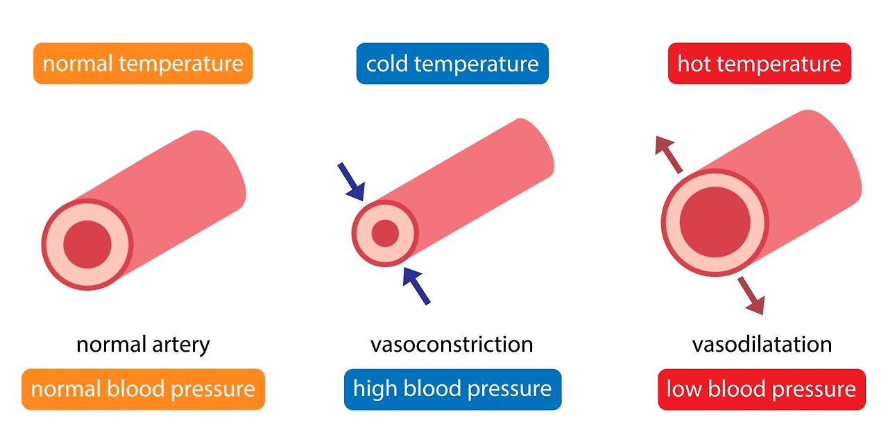 - 기온이 내려가면 체온을 지키기 위해 혈관이 좁아짐