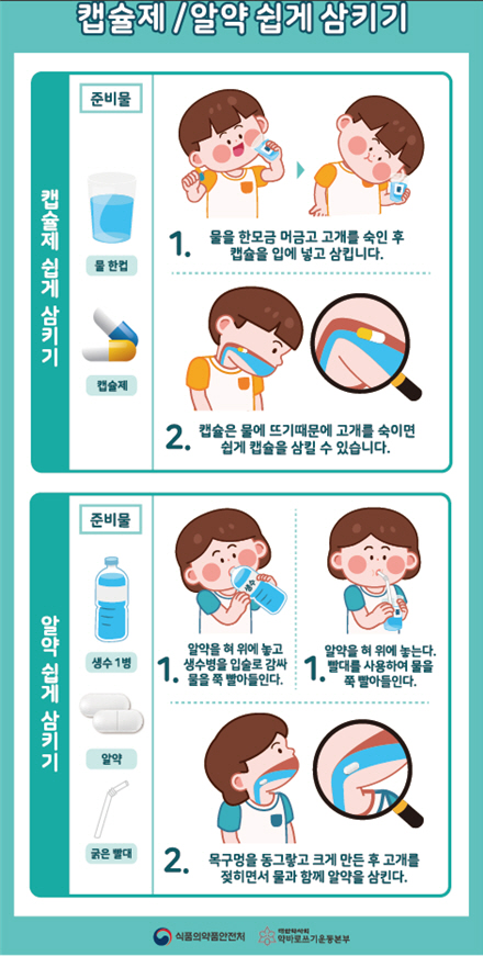 - 정제(딱딱한 알약): 고개를 뒤로 젖혀서