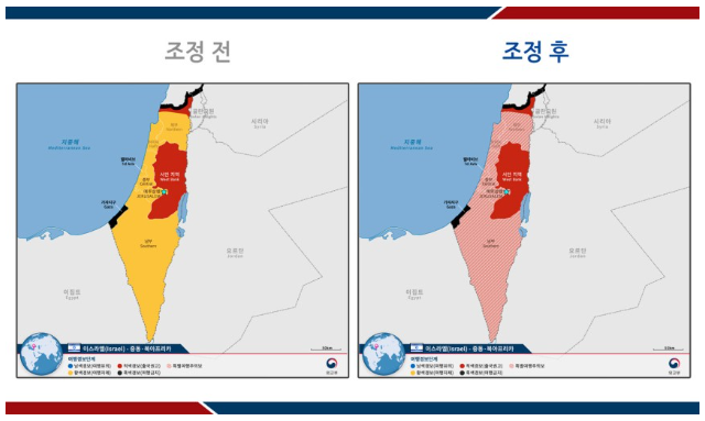| 이스라엘 북부 레바논 접경, 가자지구 | 4단계(여행금지) | 즉시 대피 및 철수 권고 |