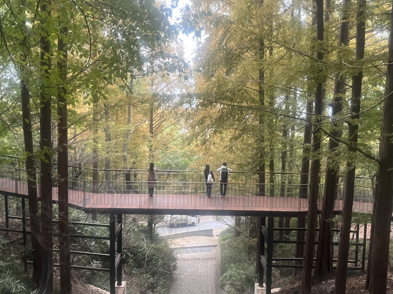 메타세쿼이아 숲을 배경으로 도심을 내려다보는 ‘바람전망다리’, 그리고 출렁다리 느낌으로 설계된 ‘모험전망다리’. 색다른 각도에서 산과 도시가 만나는 순간을 체험할 수 있어요. 다음+1