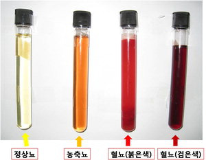 - 검붉거나 콜라색 소변