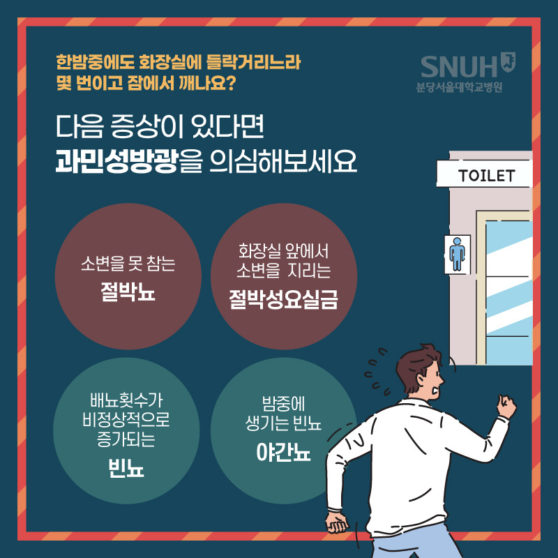 - 밤에 자주 깨서 수면이 방해된다면 방광 문제가 수면 건강에도 영향을 주고 있는 셈이니 무시하면 안 돼요.