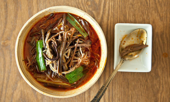 냄비에 물과 핏기를 뺀 양지머리, 대파 뿌리, 양파, 통후추를 넣어 40분 동안 끓인 뒤 뚜껑 덮고 20분 뜸 들인다. 다음 - 고기를 건져내어 식힌 후 결대로 찢고, 육수는 면보나 체로 걸러둔다. 다음