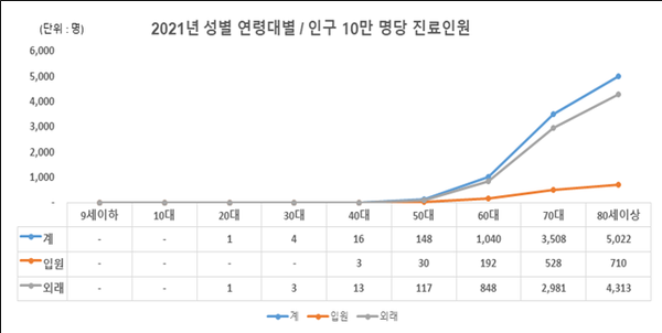 - 60대 이후 급증, 70대에서 정점